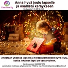 Perheiden ilmoittautumisaika joulukampanjaamme umpeutui eilen. Perheille suunnattu hakuaika meni umpeen eilen, ja mukana onkin taas iso joukko lapsia ja vanhempia. Ilmoittelemme mukaan päässeille perheille lisää joulukampanjasta viimeistään 25.10 mennessä sähköpostitse. Mikäli et saa viestiä, ja olet hakenut mukaan, ole meihin yhteydessä! Joululahjatoiveet tulevat piakkoin verkkosivuillemme sekä FB sivuille, ja jos haluat osallistua lahjoittamalla voit lähettää viestiä taikka kommentoida FB julkaisuun.