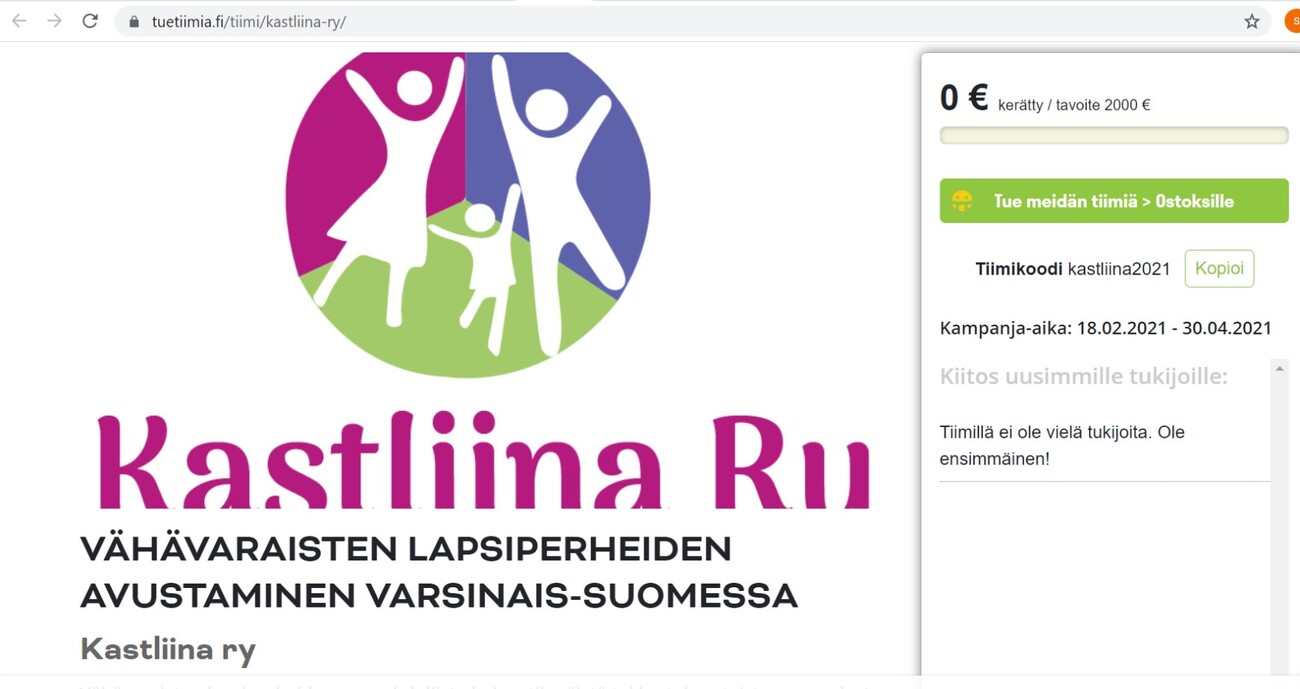 Voit tukea toimintaamme tuetiimiä.fi sivun kautta ostamalla kannatustuotteita. Nyt voit auttaa ostamalla tuetiimiä.fi sivuston todella monipuolisesta kannatustuotevalikoimasta juuri sinulle itselle, taikka lahjaksi, sopivia tuotteita. Löydät Kastliina ry:n tiimisivun osoitteesta https://tuetiimia.fi/tiimi/kastliina-ry/ Muista lisätä kassalla ostoskoriisi tiimikoodimme kastliina2021 Näet kaikista tuotteista selkeästi myös sen summan, joka ohjautuu kauttamme hyväntekeväisyyteen. Kiitos avusta! |
